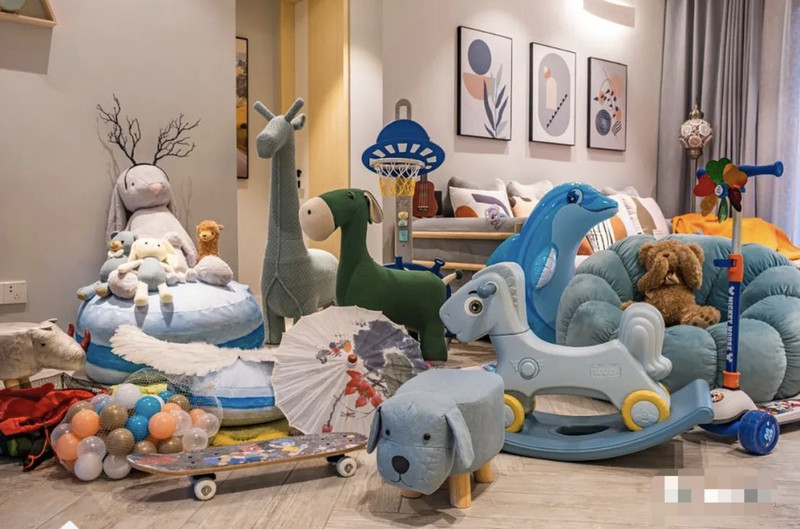 榻榻米儿童房,则是紫粉色的薰衣草风格,配合小木屋挂件和3D飞天女孩挂件,再配合唯美的干草、图片,整体风格童真而治愈、快乐而奇异。