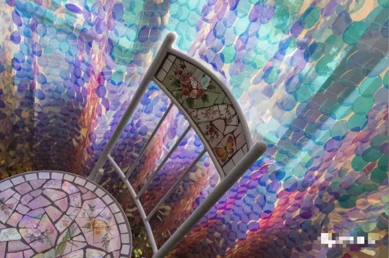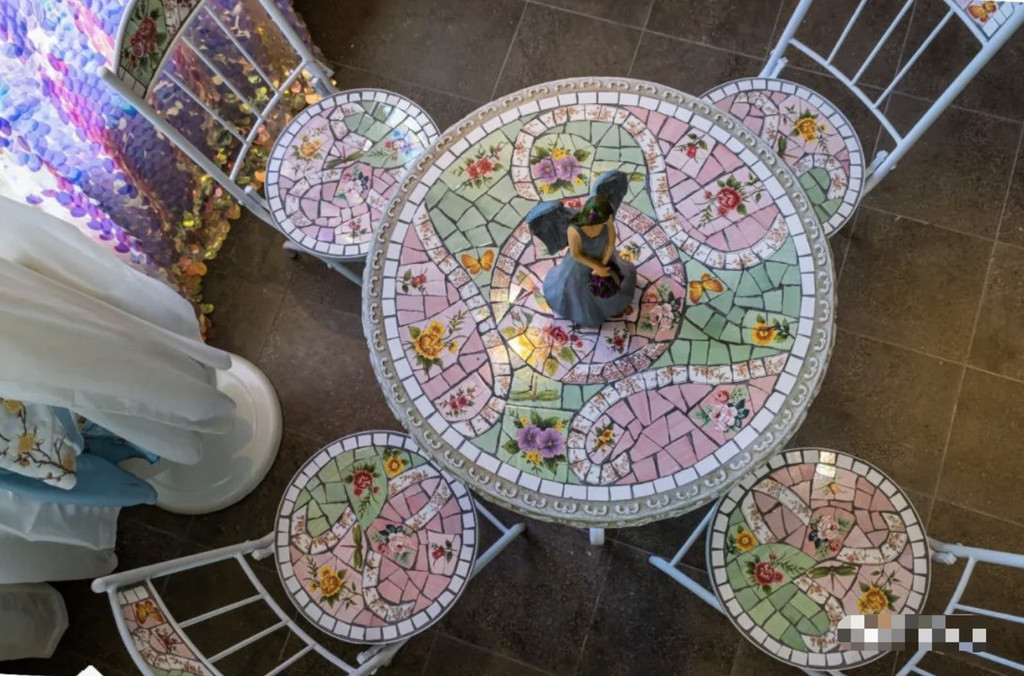 风车旁边是伊能静同款的户外桌椅,复古的花色、古典的条纹,一举超越了传统而单调的户外座椅,真正的女神专属,即使随便在椅子上自拍,或者头贴到桌面从上面俯拍,都是不曾有过的文艺大片。