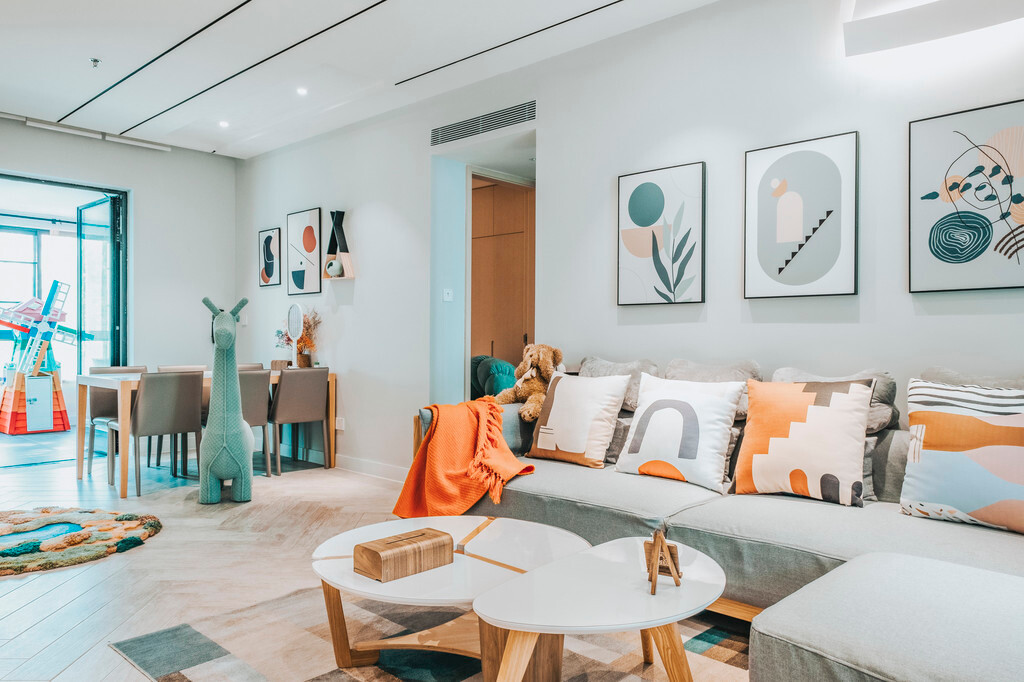 整体是大气简约的莫兰迪风格,墙面是当前最大气时尚的“太空漫步”(高级灰),然后配合莫兰迪风格挂画、沙发、地毯、钟表等等,给人以最大的放松、抚慰和治愈。