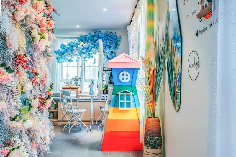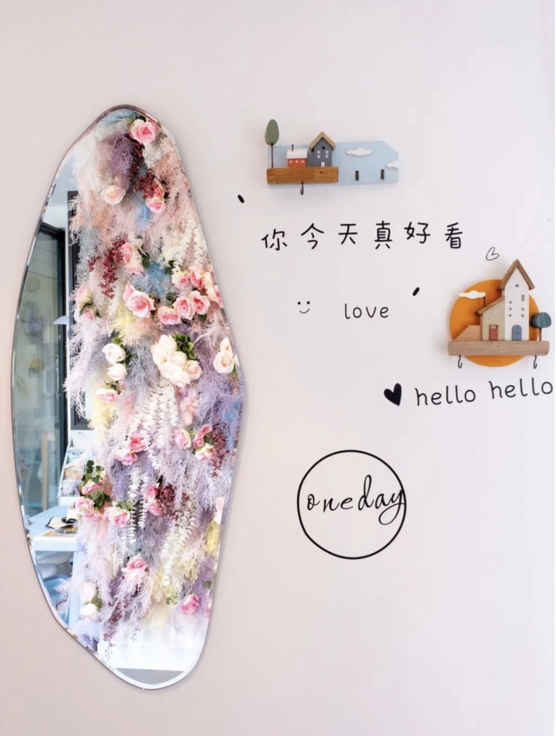 比如,现代风格的穿衣镜,旁边搭配了花瓶、芦苇等装饰,墙体还有各种童话、可爱风格的挂钩,而镜子对面就是大面积网红仙雾花墙,不仅可以直接充当拍摄背景,而且还可以透过穿衣镜充当二次背景,从而可以拍出时尚唯美大片。