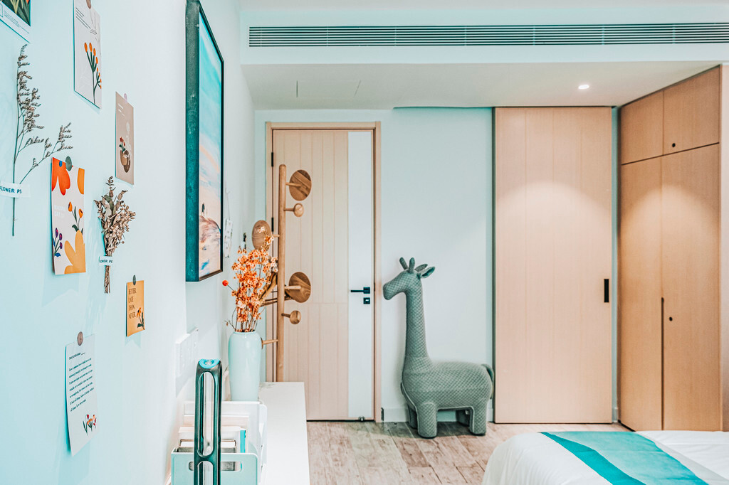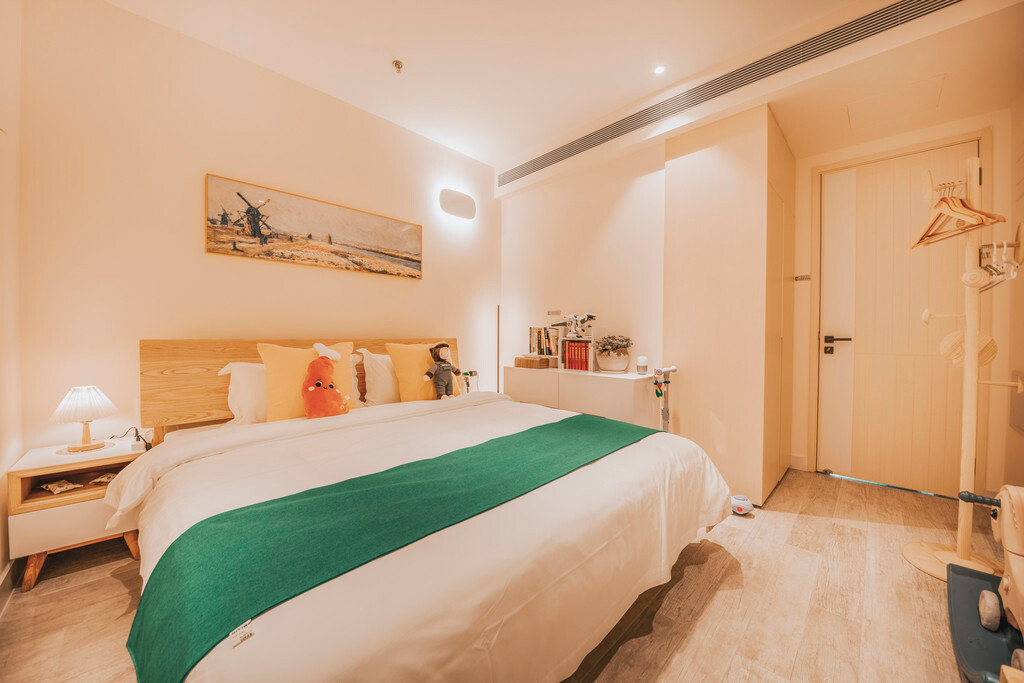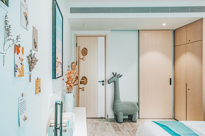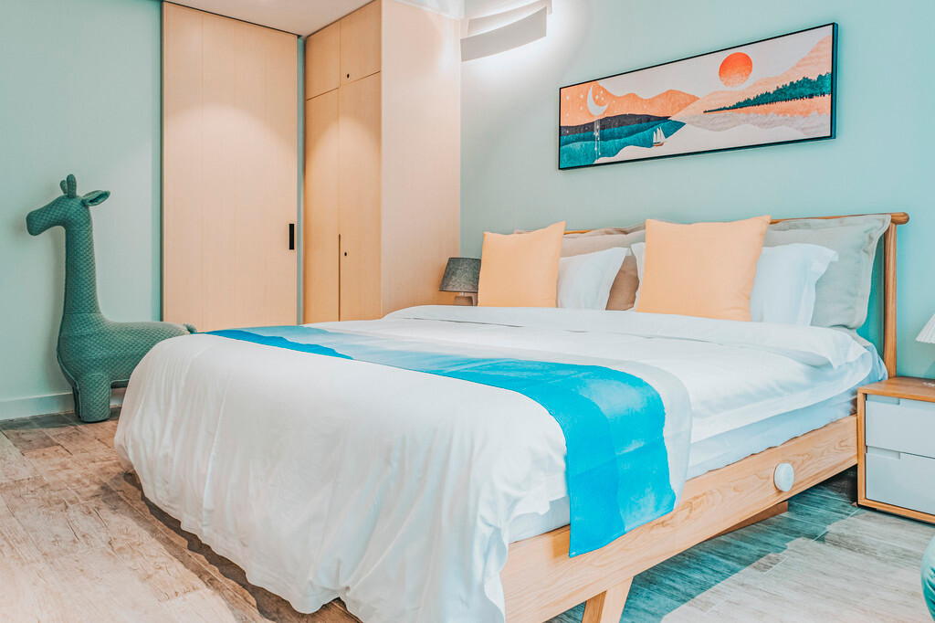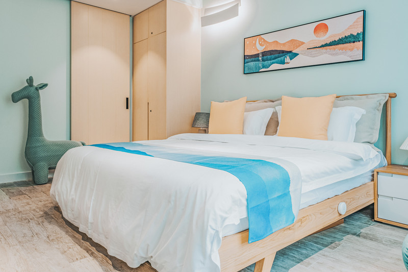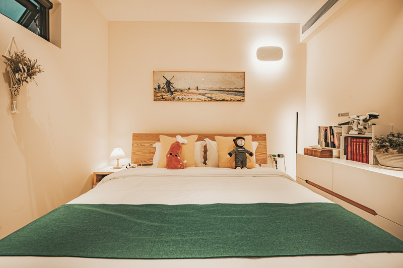 主卧是天青色、浅绿色的“北国山川”,配合精美的挂画和精致的网红挂件,让人心安、愉悦而欢喜。