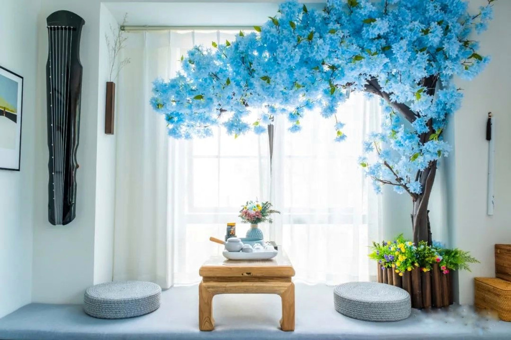 在桌椅旁边还提供了汉服、古典头饰、装饰等等,旁边则是蓝色樱花树、老榆木茶桌和蒲团,无论煮茶论道,还是古琴长笛,都可以让女神们瞬间穿越唐汉,演绎大气磅礴的古典唯美意象。