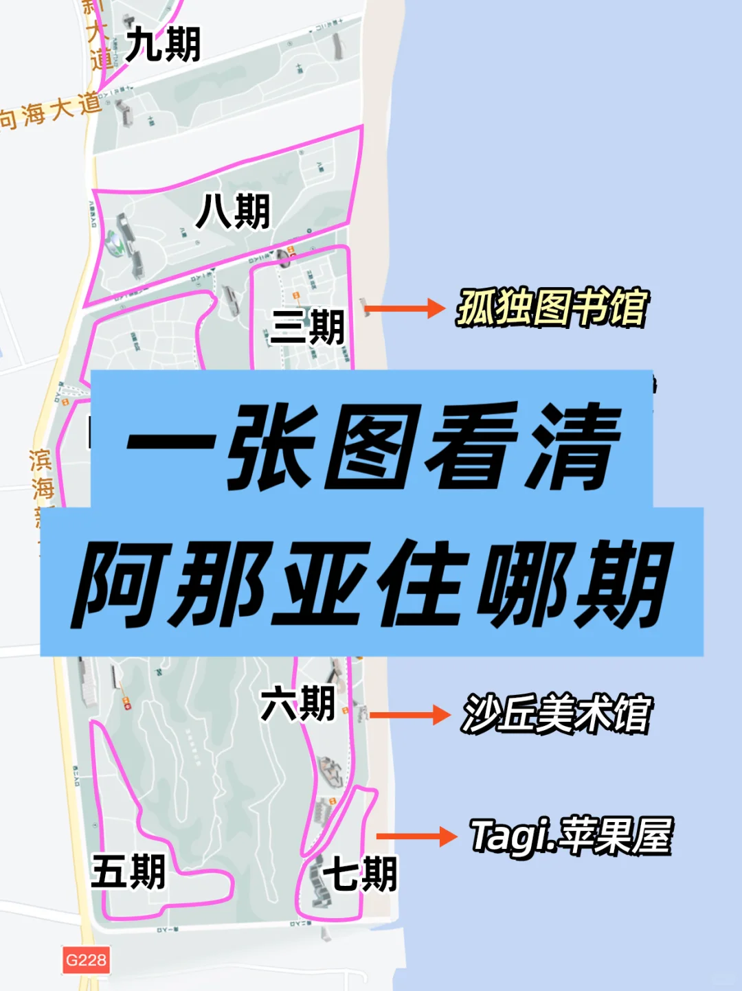 如果是第一次来阿那亚,要去地标网红打卡地,那么一期、三期、六期都是不错的选择。其中,一期、二期距离阿那亚礼堂、孤独图书馆都很近;但六期距离沙丘美术馆、苏卡酒店,柠檬泳池、无边泳池更近。同时,很多核心配套也都集中在六期,比如宿咕面包、阿那亚马场、阿那亚会所、蜂巢剧场、酒神剧场,都是来阿那亚打卡的必去之地。